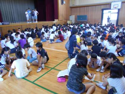 今朝はフレンド集会がありました。今日は「先生の好きな給食はに何か」というクイズ集会でした。難問続きで、子どもたちは先生のイメージをもとに3択クイズの答えを考えていました。