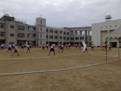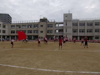 みんなの前で初めて、応援団の練習がありました。給食の時間に、ビデオで練習風景を流してきたので、何となくふりは覚えていました。手拍子や声を出すところは今日初めて覚えました。紅組、白組、どちらも負けないように大きな声を出していました。特にしっかりと声を出していたのは低学年です。