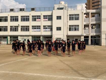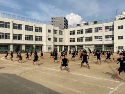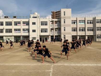本番で演技するのと同じように、黒いTシャツを着て、はちまき・たすき・リストバンドをつけて練習しました。気合を入れて練習していました。