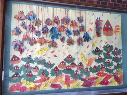 10月の玄関掲示は1年生の作品です。かわいいミノムシ、どんぐり、落ち葉が出迎えてくれています。来校された際はぜひ、ご覧ください。