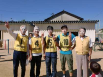 教職員が「くいだおれ」に出場した後です。パン、バナナを食べた後、牛乳を飲んで、飴を粉の中から見つけてくわえて走ります。校長先生も参加です。飴をくわえるところで皆さんの顔が真っ白になってしまいました。もちろん校長先生もです。町会長さんも参加して、記念撮影しました。
