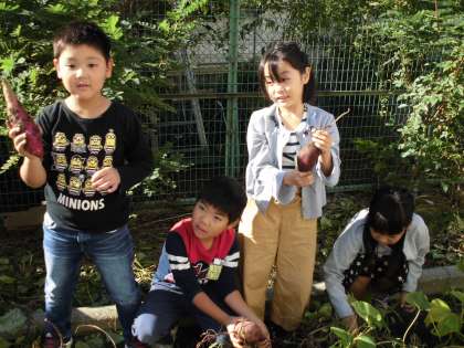 今日は、春に苗から植えたサツマイモの収穫をしました。芋ほりは、初めての子供もいてなかなか周りを掘るのがむつかしいようでした。たくさんのさつまいもが収穫できました。「おいもパーティー」が楽しみです。