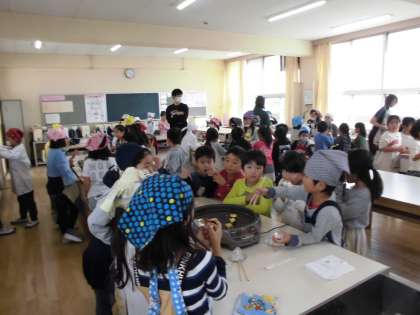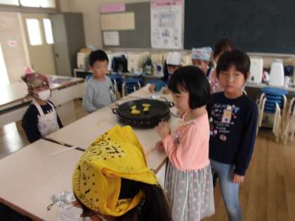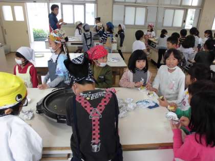 おいもパーティー開催!先日収穫したサツマイモを家庭科室で、ホットプレートで焼き食べました。朝からサツマイモやざるを洗い、1年生も招待して楽しく一緒に活動ができました。一年生から「ごちそうさま。」「おいしかったよ。」という声をいただきました。