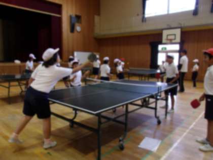 講堂で活動しているクラブの一つです。4〜6年を縦割りのグループに分け、練習したり、簡単な試合をしたりしています。互角の勝負になるところもあれば、スマッシュを打ち込まれて一方的な試合になっているところもあります。