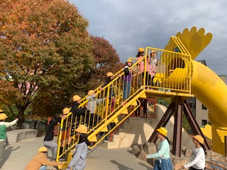 読売新聞社の見学の後、公園でお弁当を食べ、遊具で少し遊びました。雨も降らず、とても楽しく遊びました。