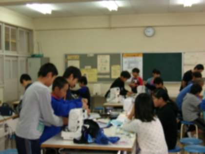しつけ縫いをしてミシンをかけます。さすがに5年生で学習したことを生かして、手際よく作業を進める子が多いです。次は、形を工夫して、ポケットをつけます。