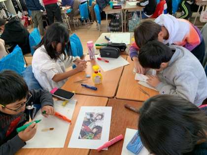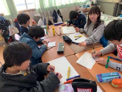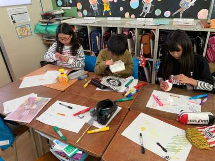 アイスクリームのスプーンとアルファベットパスタを使ってものづくりをしました。カラーペンで思い思いに模様をかいたり色を塗ったりしました。