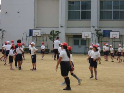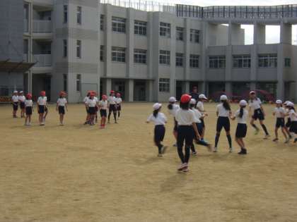 運動場から元気な子どもたちの声が聞こえてきました。4年生の体育の授業で、学年でドッジボールをしていました。