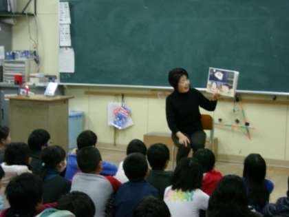 お話をしてくださったり、絵本を読み聞かせしてくださったり、紙芝居をしてくださったりと、45分があっという間に過ぎました。1年生から6年生までお話に引き込まれている眼の輝きは全く同じです。