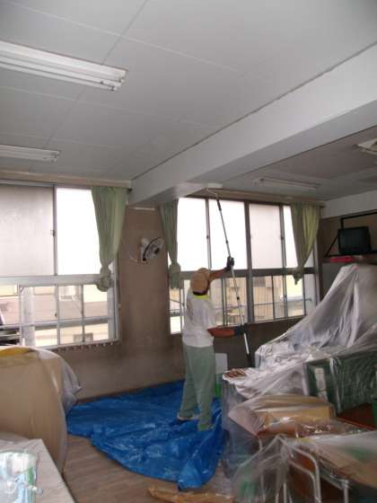 夏休みに環境整備に努めています。管理作業員さんが子どもたちがいない今しかできない作業を計画的に実施しております。下の写真は2年2組の教室の天井にペンキを塗っているところです。