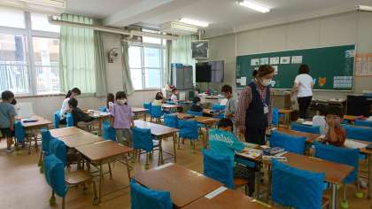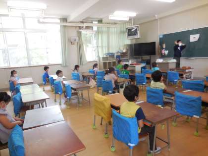 水曜日の分散登校では発育測定がありました。保健室の利用の仕方や新型コロナについてのお話をきいたあと、身長と体重を測りました。そのあとは「私の好きな物」の絵を自分の顔と一緒にパスで描きました。「何を描こうかな?」と思い思いに自分の好きな物を楽しそうに描いていました。