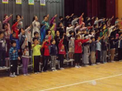 3年生は楽しい歌からスタートしました。リズムに乗って、楽しく歌いました。続いてはボディーパーカッションです。手拍子や足のリズムで音楽を奏でました。今年から学習し始めたリコーダーは、自信満々で演奏することができました。合奏や群読も気持ちを一つにして、やり遂げることができました。