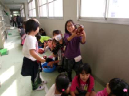 収穫したおいもをみんなできれいに洗いました。たらいに貯めたお水で丁寧に丁寧に洗いました。あまりに大きなおいもだったので、思わず落としてしまって割れたいももありました。何度も水をかえて、きれいに洗いました。