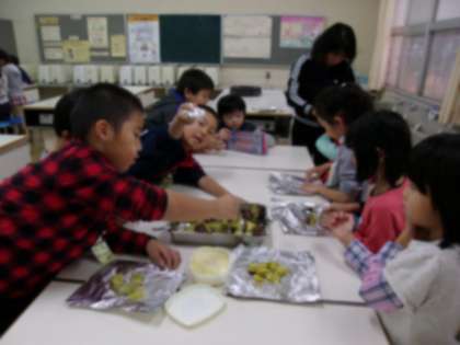土曜授業で、前日に先生が蒸しておいたおいもにバターをのせて、アルミにくるんでホットプレートで焼きました。ホクホクのおいしいおいもをみんなで楽しく食べました。おかわりをした子もいました。みんな満足そうでした。自分たちで育てたおいもは最高でした。