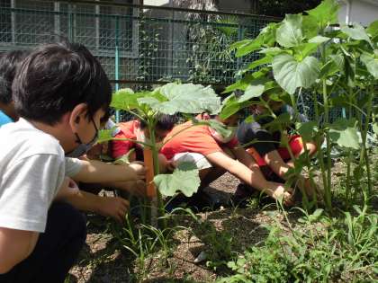 理科でヒマワリ、ホウセンカ、マリーゴールドを観察に行きました。