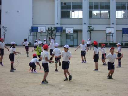 運動場では、体育の授業でなわとびやかけっこをしていました。なわを一生懸命に跳んでいる間に体はポカポカになります。