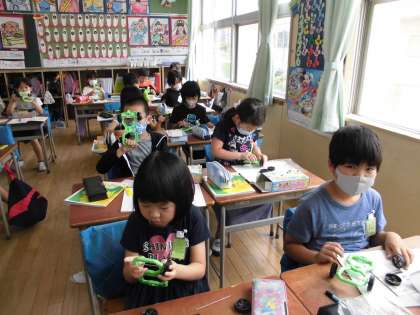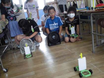 理科の実験をしました。車を組み立てて、送風機で風を送って実験をしました。