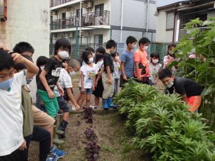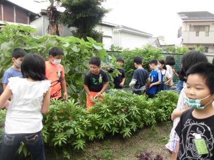 学習園のホウセンカの花が咲きました。ヒマワリは、大きなつぼみがついていました。