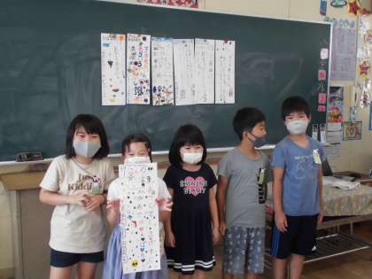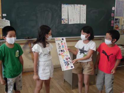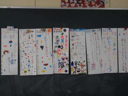 国語科でグループで話し合い合言葉を決めました。「コロナ」「運動会」「熱中症」の中から好きなテーマを選んで考えました。