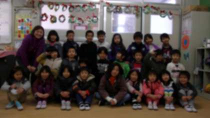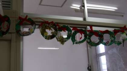16日からは、1年生の各クラスを1日ずつ回っています。今日は3組でした。図工の時間にクリスマスリースを作りました。作ったリースの前で、全員そろって記念撮影をしました。