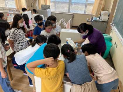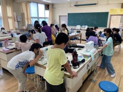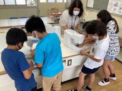 5年生は家庭科の学習でミシンを使い方を学習しています。ナップザックを作る予定ですが、現在は練習布をを使って練習しています。暑さに負けずにがんばっています☆