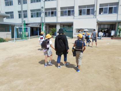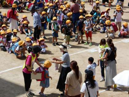 避難訓練後は保護者引き渡し訓練を実施しました。感染症対策をして、さらに例年とは違う時期ということで暑い中でしたが、ご協力いただきありがとうございました。お陰様で比較的スムーズに実施できました。今後ともご協力をお願いいたします。