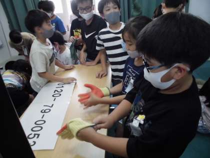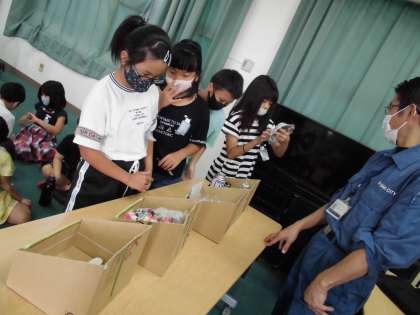 環境局の方に来ていただき、ごみの分別や、3Rなどのお話をしていただきました。クイズやゲームを交え楽しく学ぶことができました。最後にペットボトルをリサイクルしてできた定規をプレゼントしていただき、みんなとても喜んでいました。