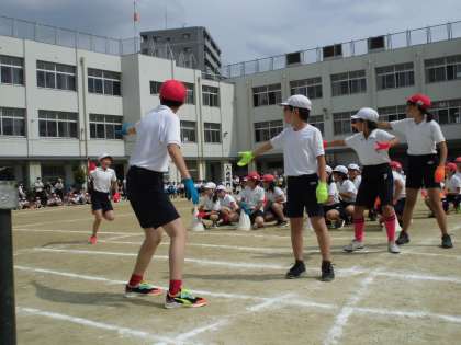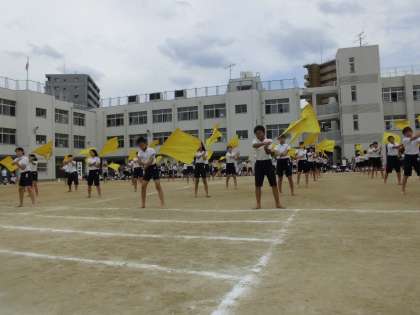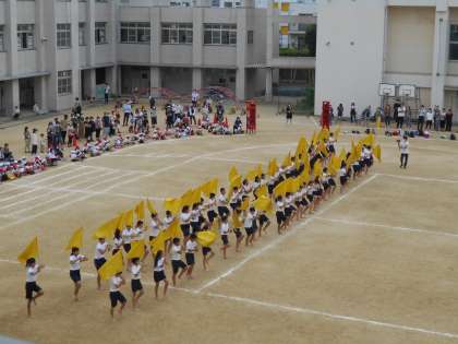 6年生はスウェーデンリレーと団体演技を行いました。今年は組立体操ができませんでしたが、「心を合わせよう」ではフラッグを使って心をあわせて演技し、小学校生活最後の団体演技を立派に終えることができました。