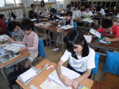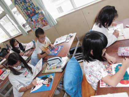 図工科でコリントゲームを作っています。今は、自分で思い思いの絵をボードに書き彩色しています。