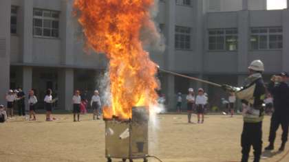 最後にてんぷら油火災実験を見ました。油に水を入れるとものすごい炎が火柱のようになって上がったので、運動場で体育をしていた2年生のほうがかなり驚いていました。