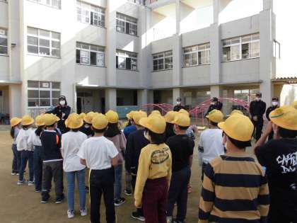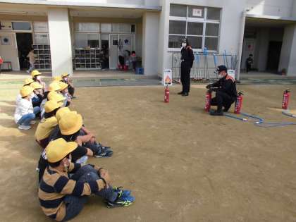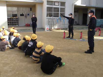 社会科で今、消防署のお仕事について学習しています。そこで、今日は消防署の方々に来ていただいて出前授業をしていただきました。