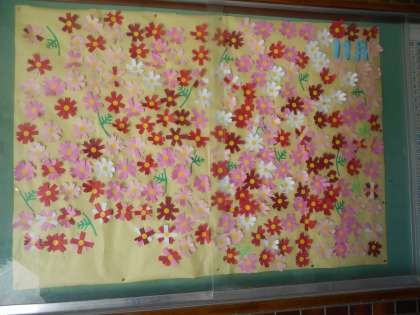 今月の玄関掲示は1年生の作品です。かわいいコスモスがたくさん咲いています。来校された際にはぜひ、ご覧ください。