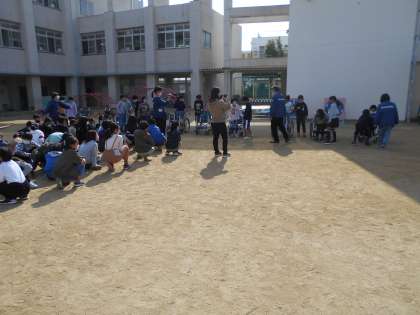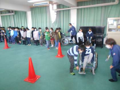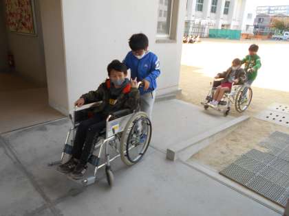 4年生は住吉区の社会福祉協議会の方にお越しいただき、車いす体験を行いました。多目的室では講話を中心に教えていただき、運動場と1階の廊下で介助について教えていただきました。