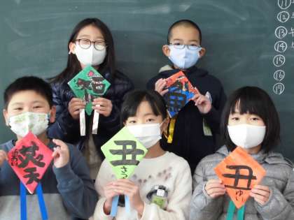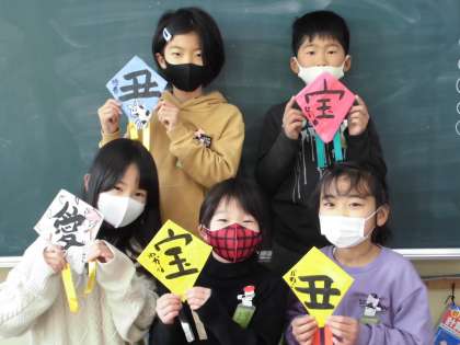 段ボールで骨組みを作り、半紙に絵の具で色を塗り好きな字を書いて一人ひとりそれぞれの凧を作りました。天高く舞い上がれ!