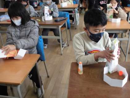 牛乳パックを使って絵本を作ります。今日は牛乳パックに画用紙を貼り付けました。牛乳パックのご協力をありがとうございました。