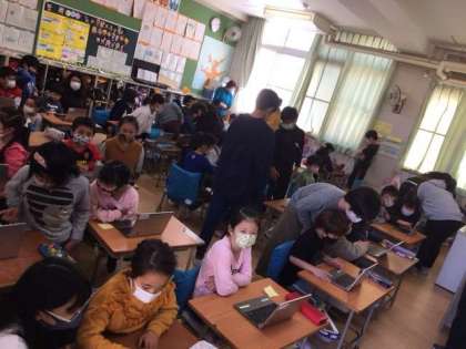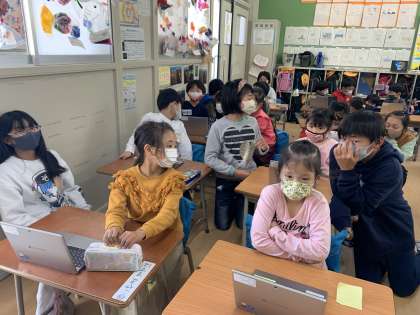 6年生がフレンド班の1年生をサポートし、入力の仕方を優しく教えていました。