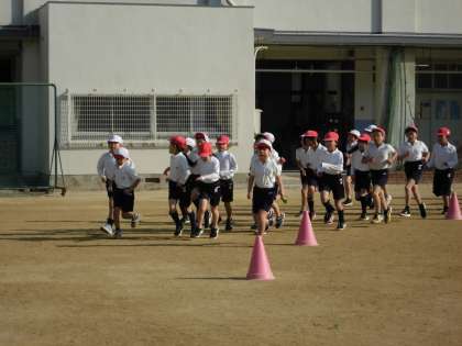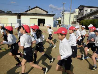 体育で持久走をしました。運動場を三十周全員で並んで走り切ることができました。素晴らしいです。子どもたちは、お互いに励まし合いながら頑張っていました。