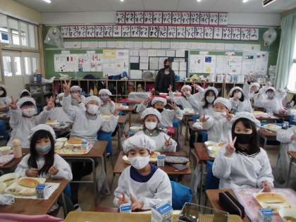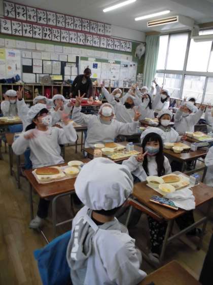 六年生の卒業をお祝いして今日は、給食の献立が一つ多く、朝から子供たちはとても楽しみにしていました。おいしくいただきました。
