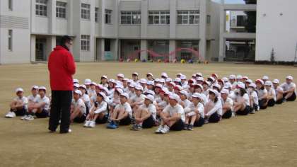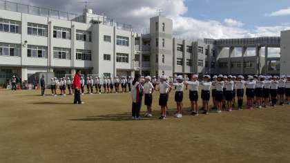 墨江丘中学校の体育の先生にお越しいただいて、体育の授業を体験しました。中学校の体育の心構えときびきびとした動きについてはじめにお話がありました。難しい動きをするのではなく、みんなができることを一緒にする、そろえて行動することを学習しました。基本の姿勢から休めや向きかえ、整列など、張り詰めた空気の中で指導が進みました。先生から「しーんとした空気を感じなさい。ガサガサやゴソゴソはいりません。」と何度も話がありました。