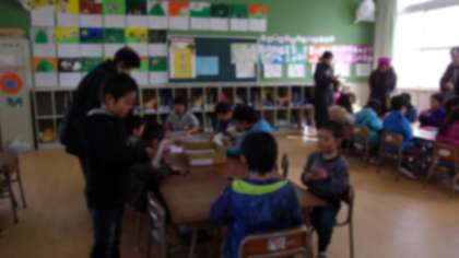 1年生は、「こうりゅうかいへ ようこそ」 先日、保育所や幼稚園の子どもたちと行った交流会を、保護者と一緒にしました。遊びのコーナーをいろいろ設けて、子どもたちが説明をして遊びます。子どもたちの笑顔がよかったです。