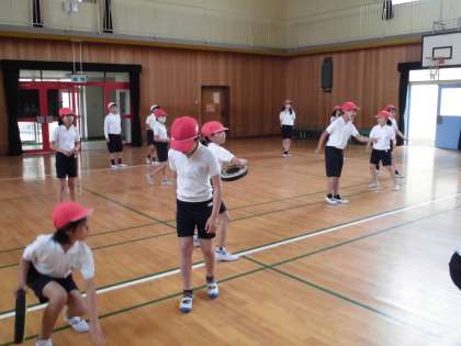二列、四列に並ぶ練習や体幹を鍛える練習をした後にドッチビーの練習をしました。