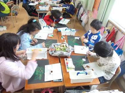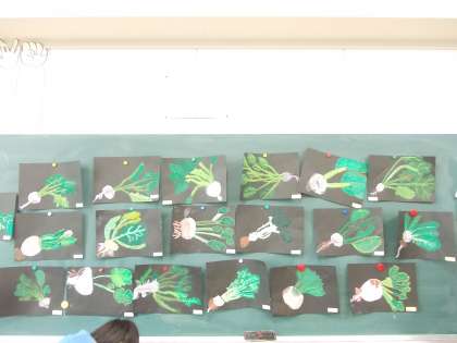 先日収穫した天王寺かぶらの絵を描きました。自分たちが育てたかぶらなので、よく見てしっかりと描きました。黒い画用紙に描いたので、かぶらの白い色や、葉の黄緑の感じがうまく描けました。「描いている途中にとてもいい香りがしてきて、おいしそうだった。」と話している子もいました。がぶら独特のいい香りで、早く食べたくなったそうです。どの子も勢いのあるシャキッとしたかぶらが描けました。