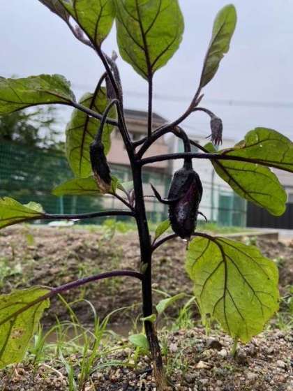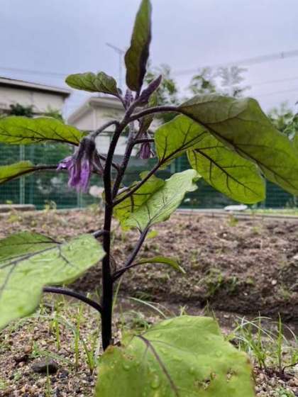 学習園の畑に植えたナスにも花と実がつき始めました。