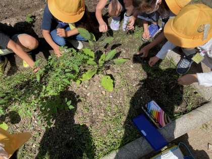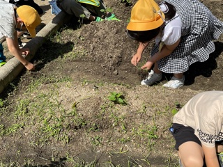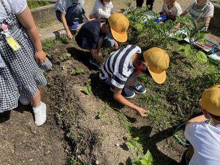 学習園の畑に雑草が増えているので、子どもたちに雑草抜きをしてもらいました。抜くときのポイントを伝えてから始めると、ゲームのように夢中になって取り組んでいました。