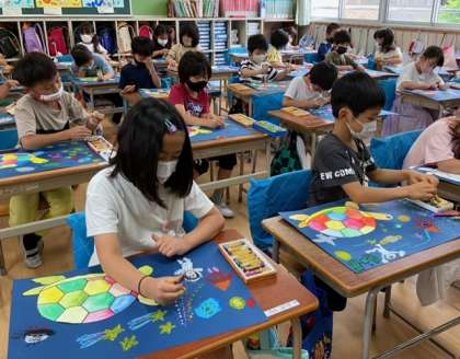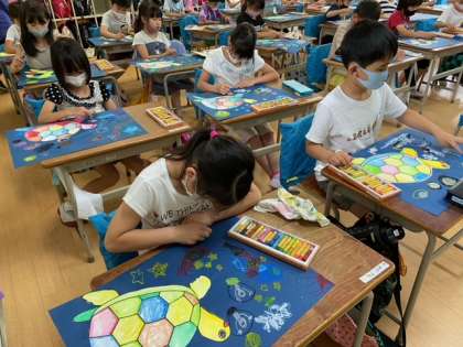 日曜授業で2回目の絵の具をしました。画用紙に貼り「宇宙をとぶ かめさん!」を楽しく描いています。