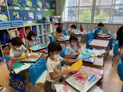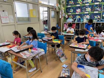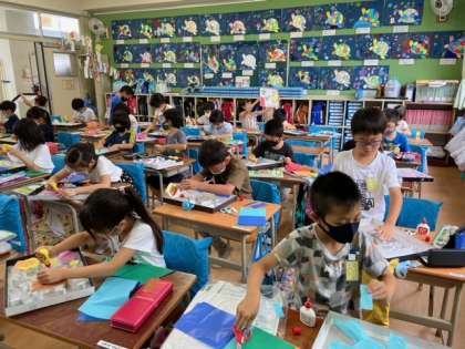 図工で「光のプレゼント」の作品に取り組んでいます。明るい方へかざしてみると、淡い色が絵についてとってもきれいです。「きれ〜っ!」と目をキラキラさせながら作っています。