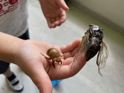 セミの幼虫と成虫です。手に乗せて見せてくれました。幼虫は元気に動いてつめをたてるので、手からかごに入れるとき痛かったと教えてくれました。もう夏ですね。