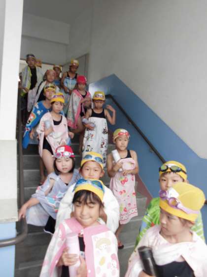 よいお天気の中、プールに入りました。バタ足、息継ぎ、クロールの練習をした後にリレーを全員でしました。