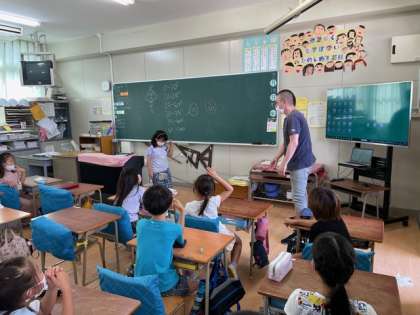 英語でじゃんけんの掛け声のかけ方を教えてもらいました。「グー」は石(ロック)、「チョキ」はハサミ(シーザー)、「パー」は紙(ペーパー)です。いつもと違う掛け声でのじゃんけんに子どもたちはノリノリでした。