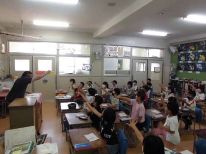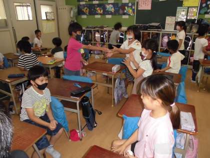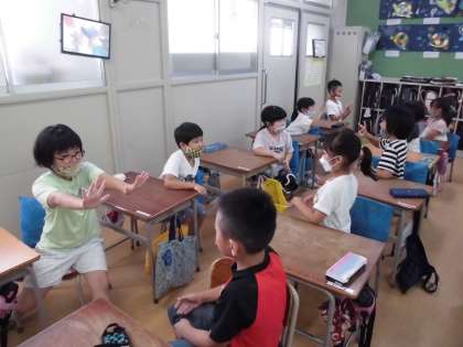 数の数え方も教えてもらいました。紙のボールをペアの友達とキャッチボールをし、「10回投げあえるかな?」に、チャレンジ!「ワン、ツウ、スリー…わわわ」。とあちこちで子ども達のはしゃぐ声が聞こえてきました。